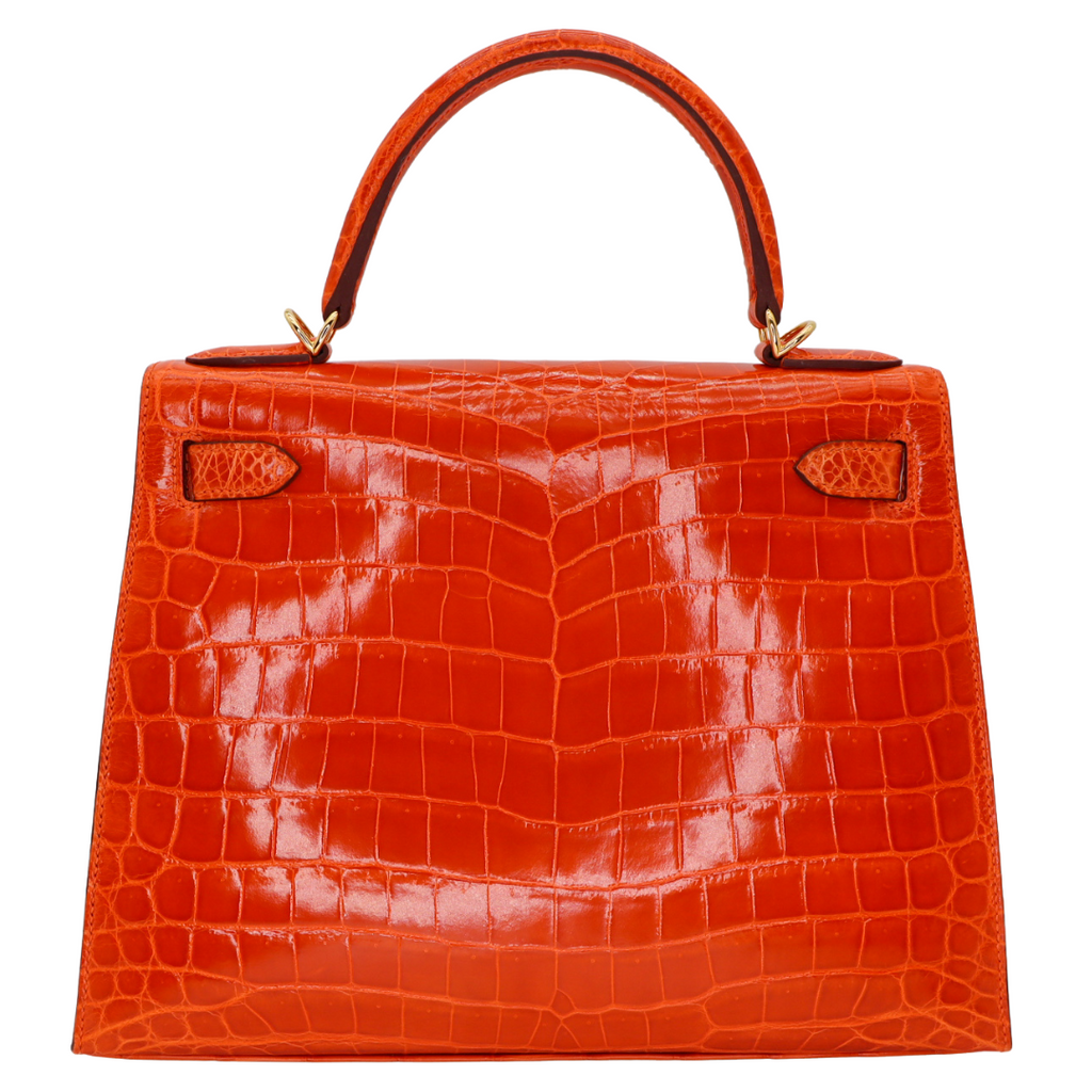 Hermès 28cm Kelly Sellier Orange Shiny Niloticus Crocodile Gold Hardware